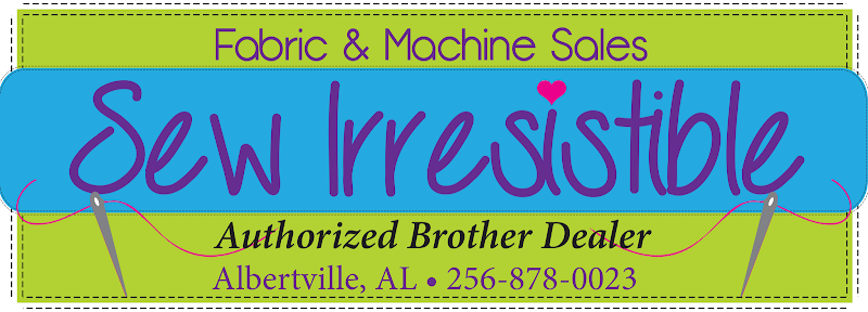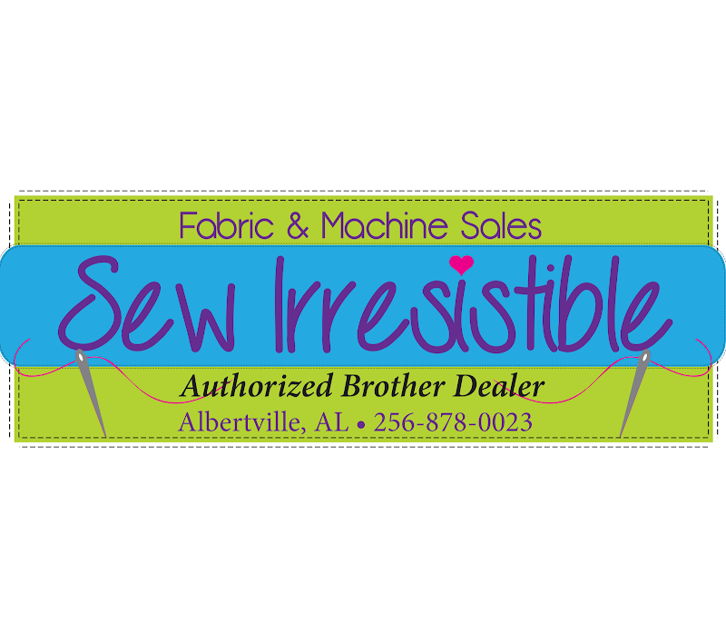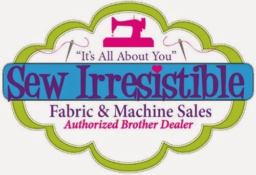 The image features the logo of Sew Irresistible, a sewing store specializing in fabric and machine sales.