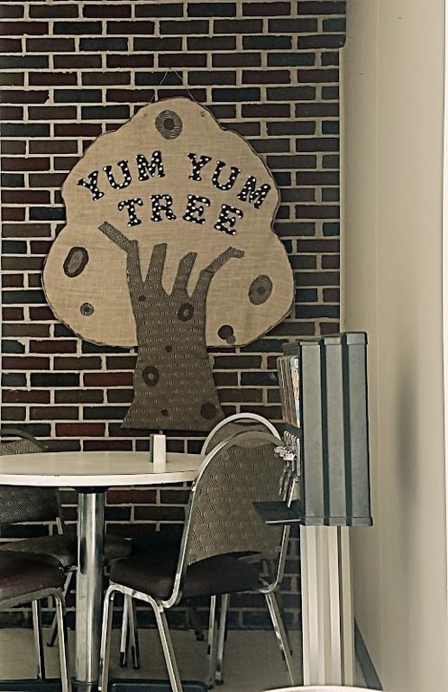 The image shows a cozy corner of Sew Irresistible, featuring a whimsical "Yum Yum Tree" wall hanging against a brick backdrop.