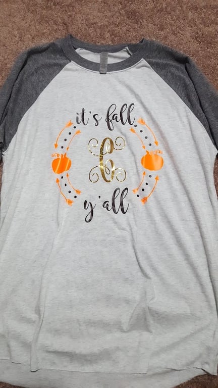 A gray and white raglan shirt features a festive fall design with pumpkins and the text "it's fall y'all" in gold and orange.