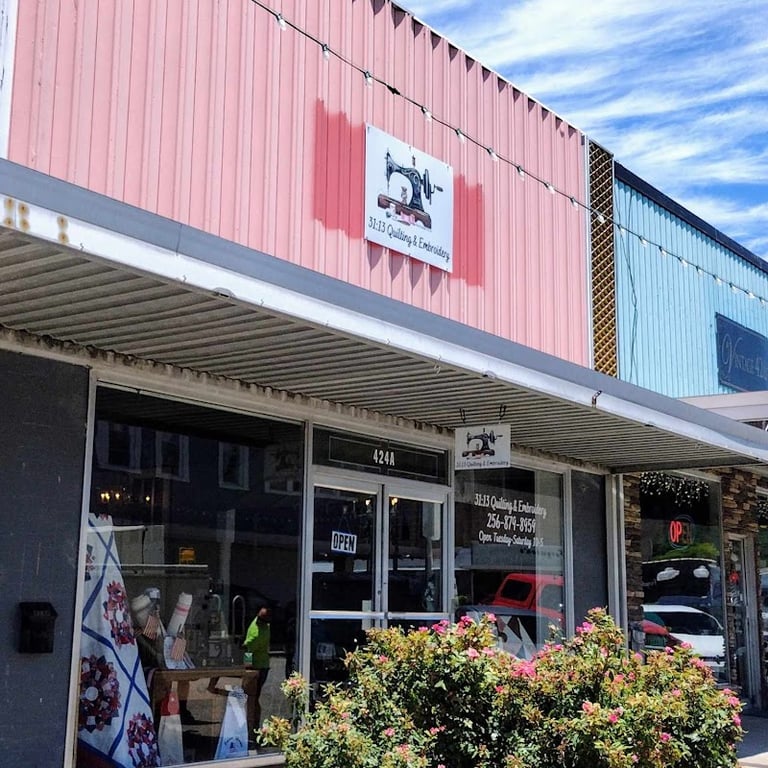 A vibrant storefront of 31:13 Quilting and Embroidery features a welcoming "OPEN" sign and displays of colorful fabrics and sewing supplies.