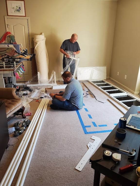 Two men are assembling shelving units in a sewing store's interior, surrounded by fabric rolls, sewing supplies, and tools.