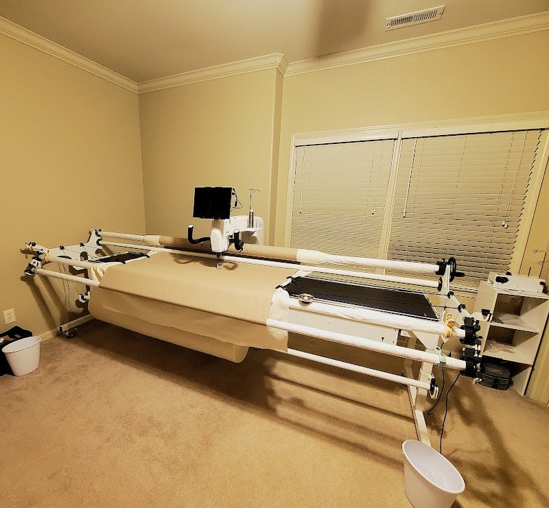 The image shows a spacious sewing room featuring a large quilting machine set up on a frame, with a beige fabric ready for use.