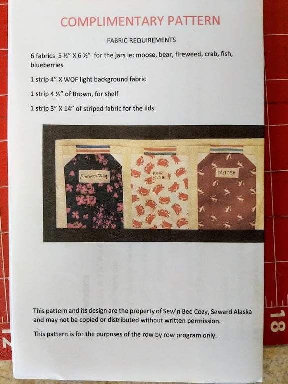 The image features a sewing pattern from Sew 'n Bee Cozy, showcasing fabric requirements for jars themed with moose, bear, and crab designs.