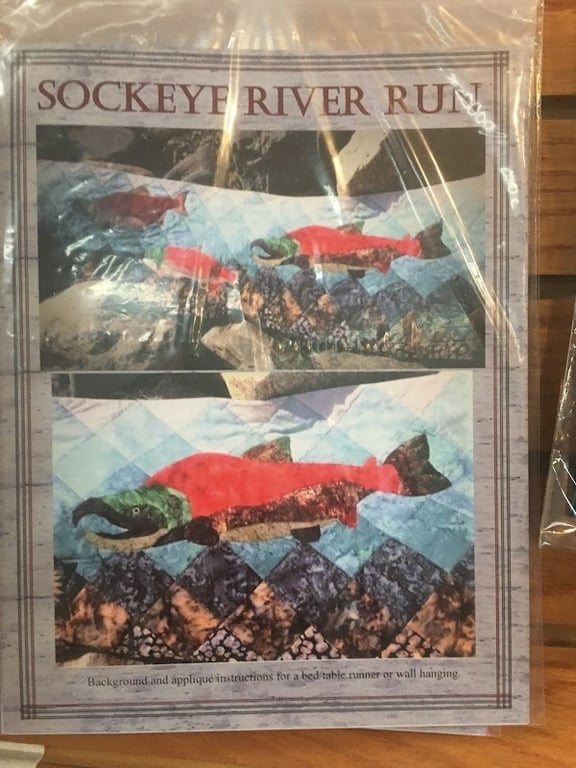 The image features a sewing pattern titled "Sockeye River Run," showcasing colorful quilt designs with fish motifs.