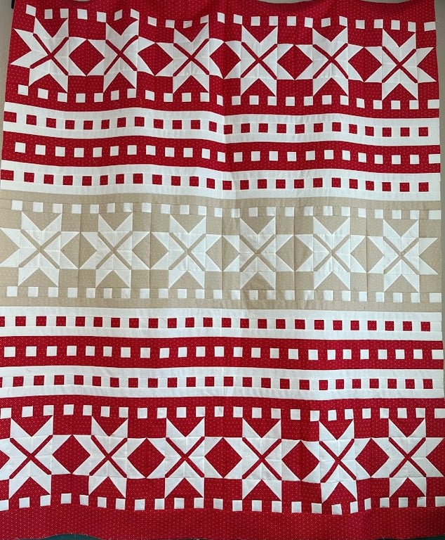 The image showcases a vibrant quilt featuring a geometric pattern in red, white, and beige.