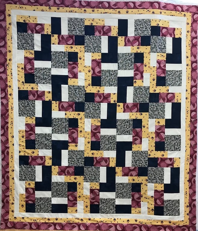 The image showcases a vibrant quilt featuring a geometric pattern with navy, yellow, and floral fabrics.