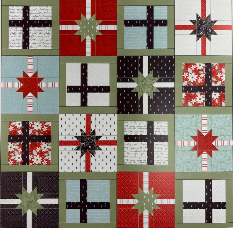 This image showcases a vibrant quilt featuring a variety of star patterns in red, green, black, and white fabrics.