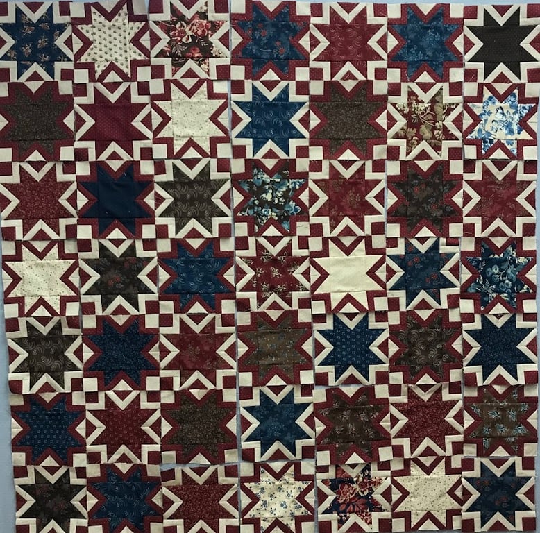 The image showcases a vibrant quilt featuring star patterns in rich reds, blues, and creams, highlighting various fabric textures.