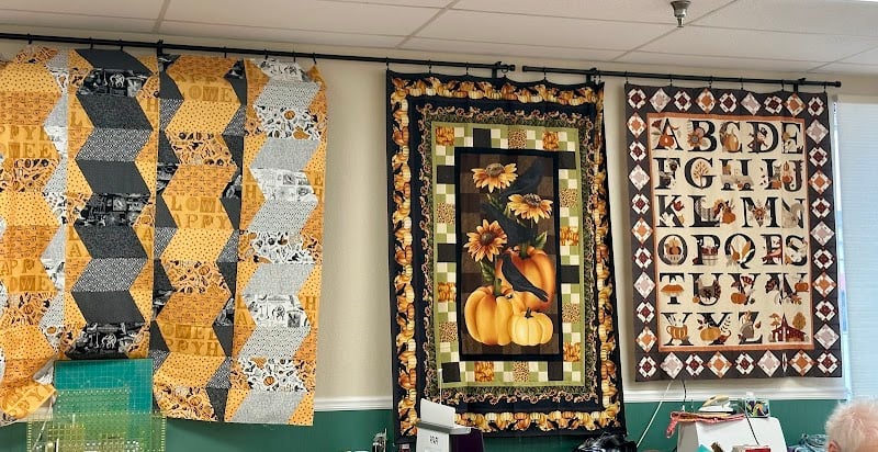 The image showcases vibrant quilt displays in a sewing store, featuring patterns with pumpkins, sunflowers, and alphabet designs.