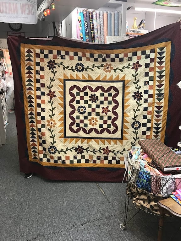 The image showcases a beautifully crafted quilt displayed prominently in a sewing store.
