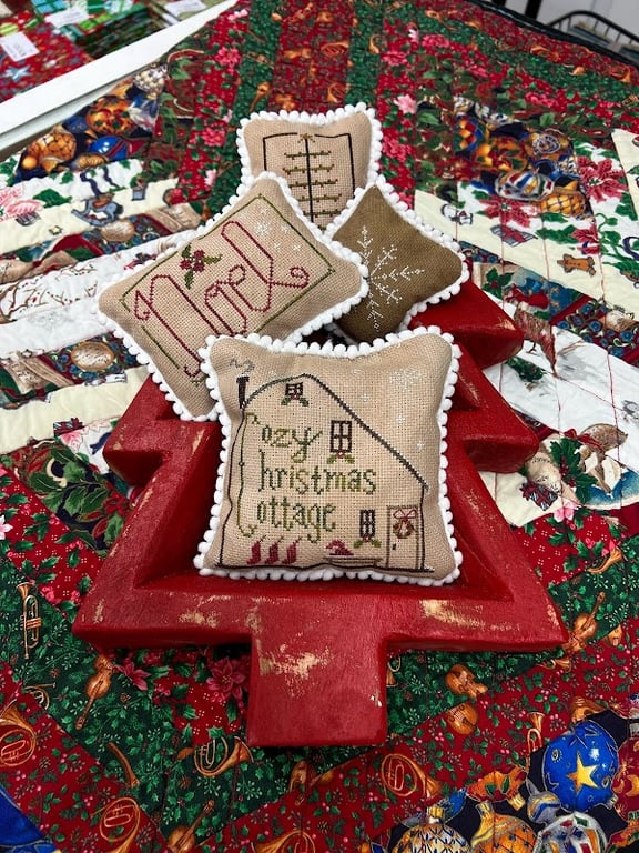 The image features decorative pillows with festive designs, including "Noel" and "Merry Christmas Cottage," displayed on a red wooden tree.