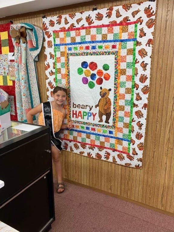A young girl stands beside a colorful quilt featuring a bear and balloons, showcasing vibrant fabrics in a cozy sewing store.