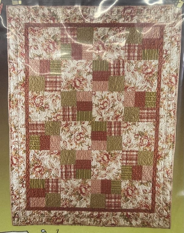 The image features a beautifully crafted quilt showcasing a floral and plaid pattern in warm tones of red and green.