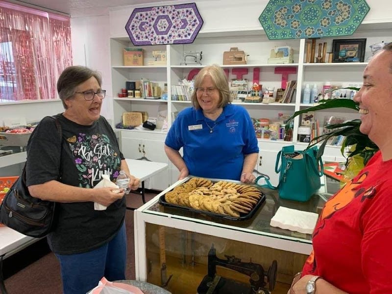 Inside Sew Fancy Fabric & Quilting, two customers engage with a friendly staff member while enjoying freshly baked cookies.