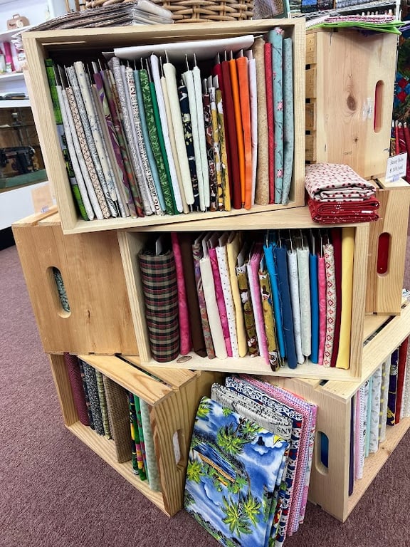 The image showcases a vibrant display of various fabric bolts organized in wooden crates at Sew Fancy Fabric & Quilting.
