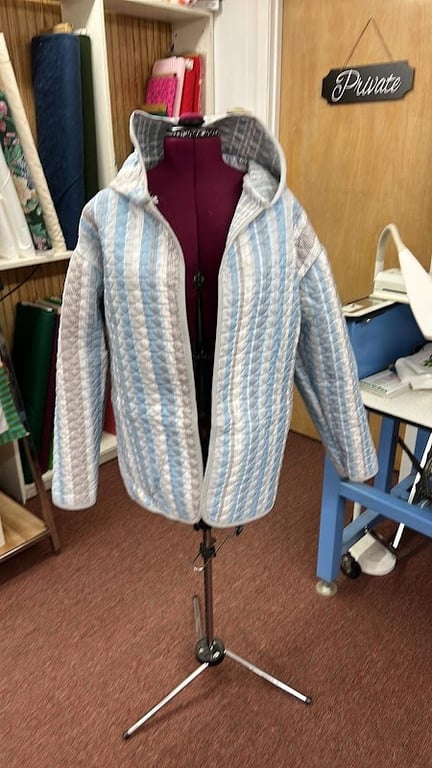 A quilted blue and white jacket is displayed on a dress form in a cozy sewing store. The background features shelves filled with colorful fabrics and sewing supplies.