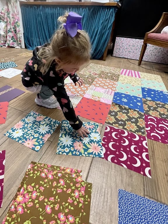 A young child is arranging colorful fabric squares on a wooden floor in a sewing store.