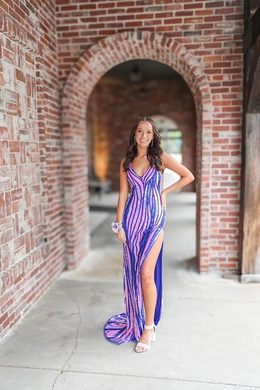 The image features a young woman in a stunning pink and purple sequined gown, standing in a brick archway.