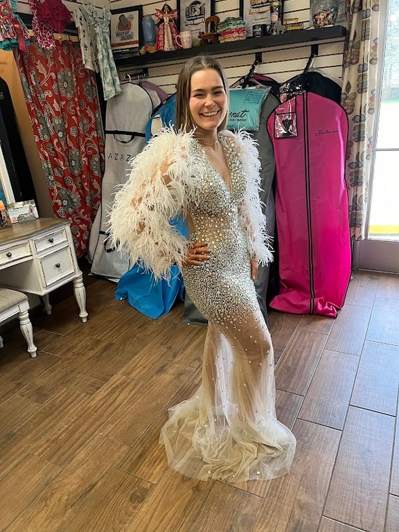 A smiling woman models a glamorous, beaded gown with feathered sleeves in a sewing store.