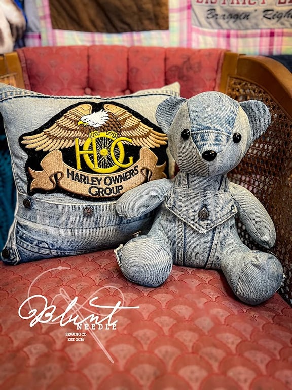 A cozy corner of Blunt Needle Sewing Co features a denim teddy bear and a decorative pillow with a Harley Owners Group emblem.