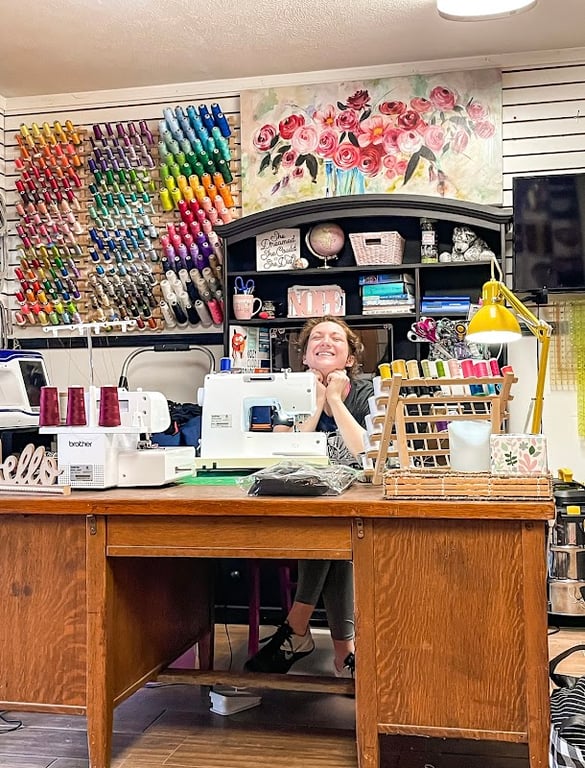 The image shows a cheerful woman at a wooden sewing table surrounded by sewing machines and colorful spools of thread on the wall.