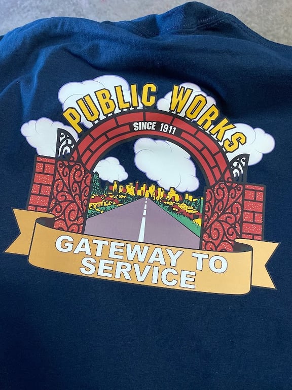 The image features a vibrant graphic design on a dark fabric, showcasing the words "PUBLIC WORKS" and "GATEWAY TO SERVICE" with an illustrated arch and a colorful cityscape.