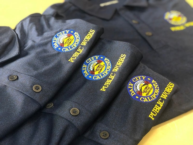 The image features neatly folded navy blue polo shirts, each adorned with vibrant embroidered patches that read "Daly City Public Works.