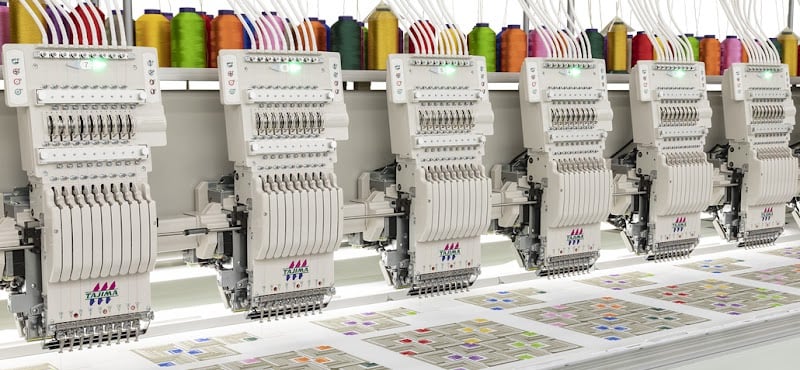 The image showcases a row of advanced embroidery machines at BOV Embroidery, surrounded by vibrant spools of thread.