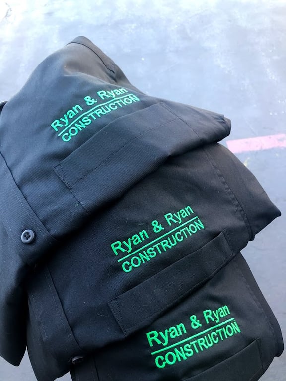 The image features several black shirts embroidered with "Ryan & Ryan CONSTRUCTION" in bright green thread. The shirts are neatly stacked, showcasing the quality of the embroidery.