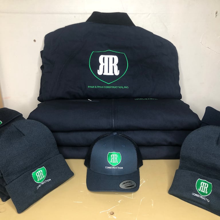 The image showcases a display of embroidered apparel from Ryan & Ryan Construction, including dark jackets, beanies, and a cap.