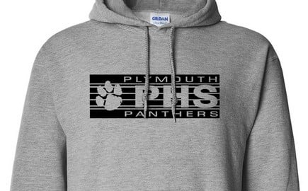 The image features a gray hoodie with a prominent black and white graphic displaying "Plymouth PHS Panthers." The design includes a paw print, emphasizing school spirit.