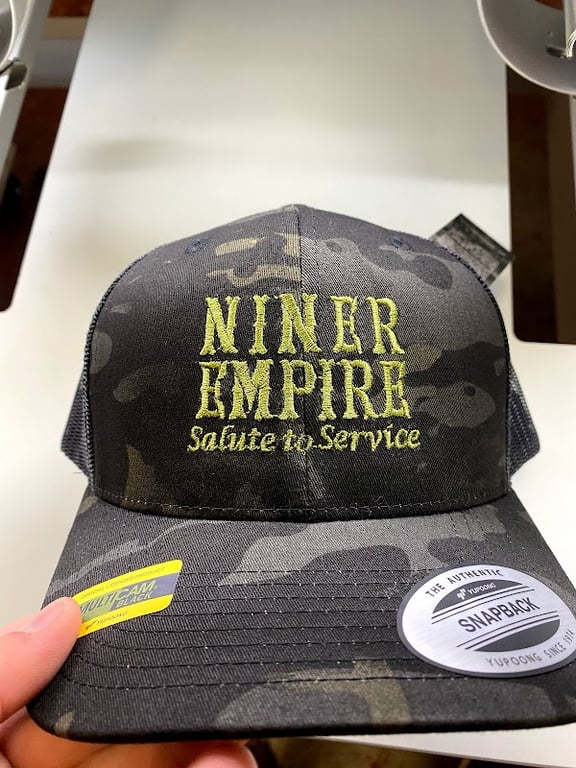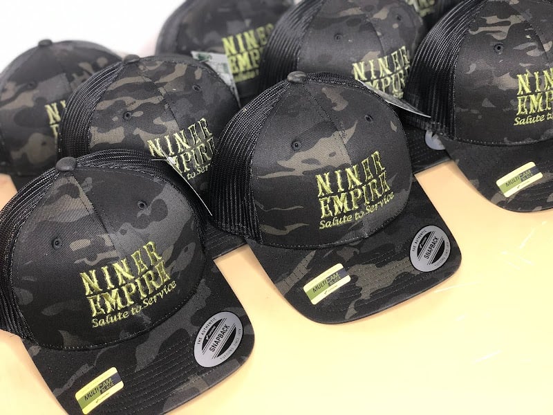 A close-up of a camouflage cap featuring the embroidered text "NINER EMPIRE Salute to Service.