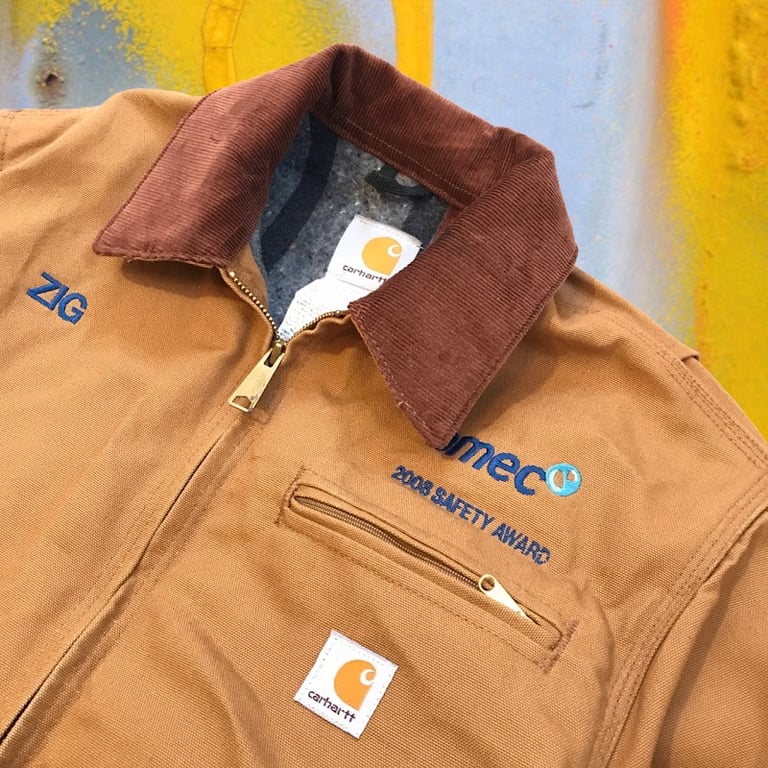 The image features a close-up of a brown work jacket with a corduroy collar, showcasing embroidered logos and a zippered pocket. The background is colorful, adding visual interest.