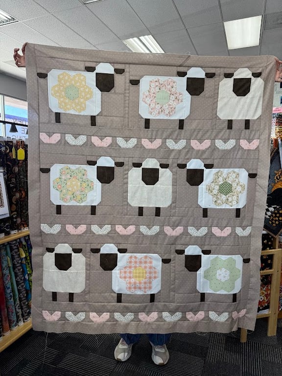 A customer holds up a whimsical quilt featuring sheep and floral patterns in a sewing store.