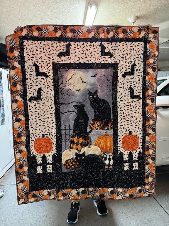 A person holds up a vibrant Halloween-themed quilt featuring black cats, pumpkins, and a full moon.