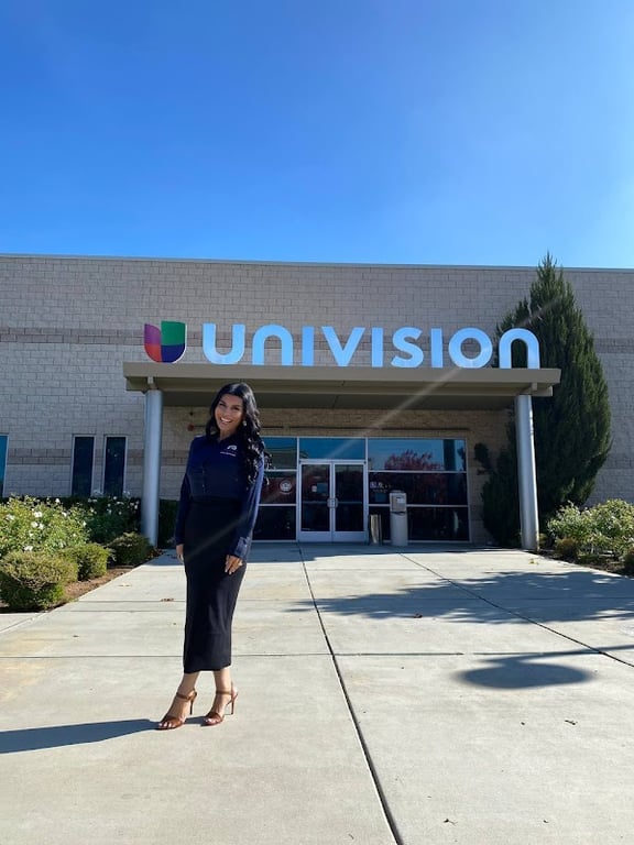 The image shows a woman standing outside a modern building with a prominent "Univision" sign.