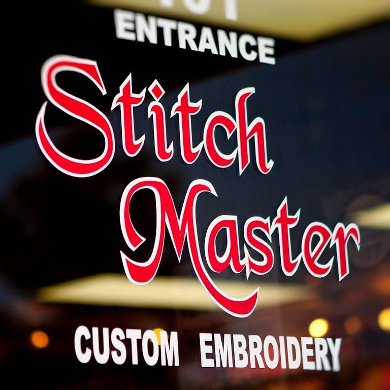The image features the storefront of Stitch Master Custom Embroidery, showcasing a prominent sign with elegant lettering.