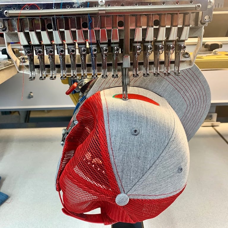 The image shows a close-up of a multi-needle embroidery machine working on a red and gray cap.