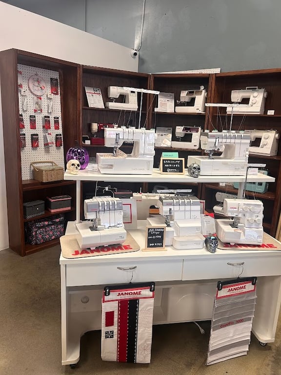 A well-organized display features various Janome sewing machines and sergers on a white table, surrounded by shelves stocked with sewing tools and accessories.