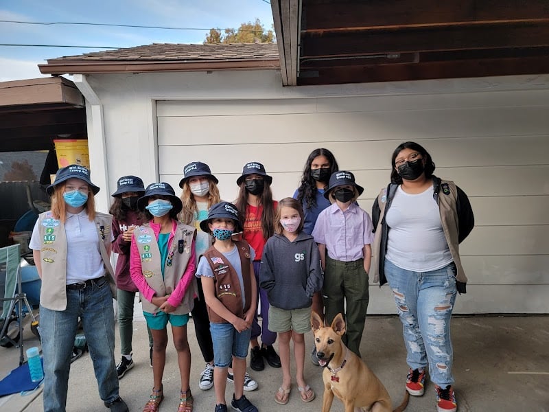 A group of children and adults, wearing masks and hats, pose together outside a sewing store. They are dressed in casual clothing, with some wearing Girl Scout vests.