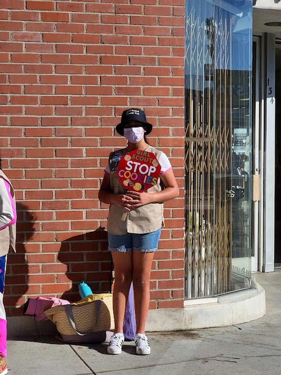 A Girl Scout stands outside a brick building, holding a colorful "Stop Cookies" sign. She wears a beige vest and a bucket hat, with a backpack and water bottle nearby.