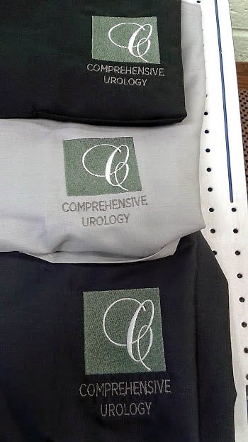 The image showcases embroidered fabric samples featuring the logo for "Comprehensive Urology" in various colors.