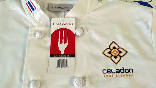 The image features a white chef's jacket with a tag from Chef Works, showcasing the brand and a logo for Celadon Thai Kitchen.