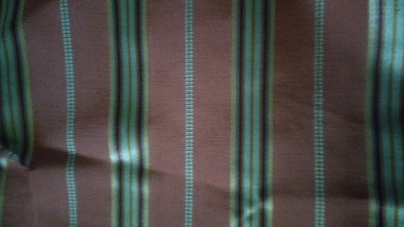 The image features a close-up of a fabric with brown and green vertical stripes, showcasing the texture and pattern.