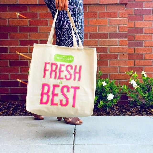 A person holds a large, cream-colored tote bag with the phrase "FRESH is BEST" printed in bold pink letters.