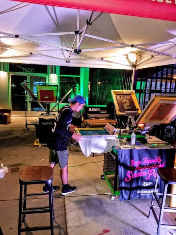 A young man works at a screen printing station under a tent, surrounded by equipment and illuminated by bright lights.