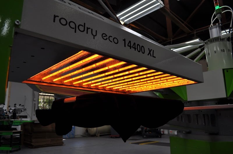 The image shows a roqdry eco 14400 XL drying machine in a sewing store, with a black fabric being dried underneath bright orange heating elements.