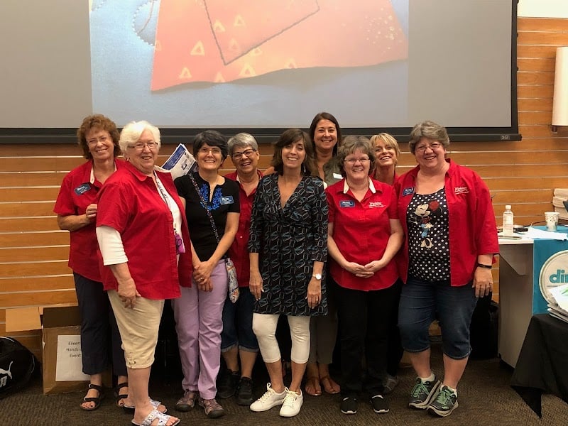 A group of smiling women in red shirts stands together in a sewing store, showcasing a friendly community atmosphere.