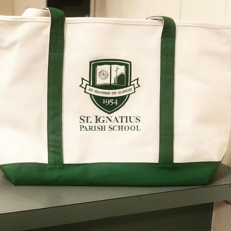 A white tote bag with green straps features the embroidered logo of St. Ignatius Parish School, showcasing a blend of functionality and school spirit.