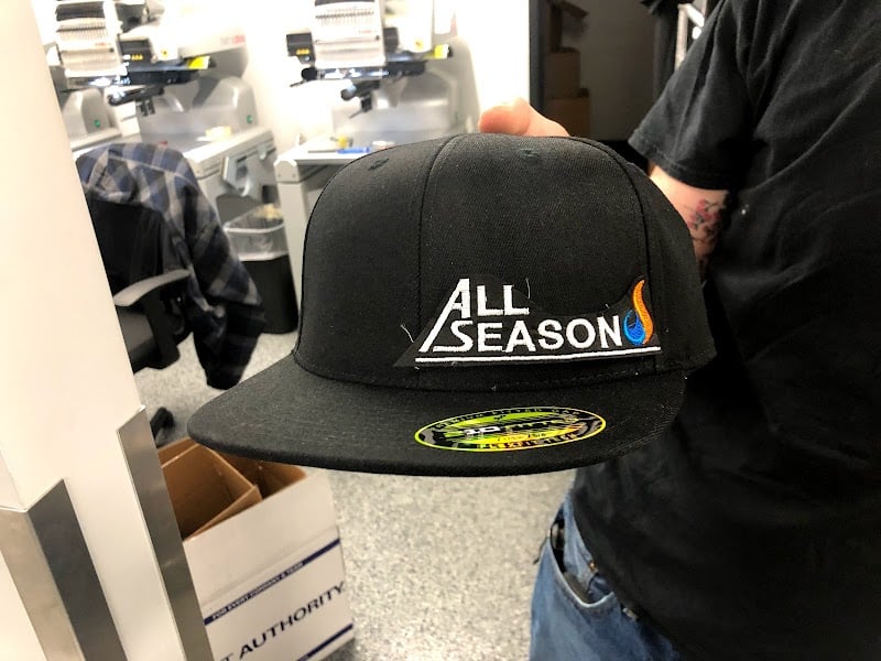 A person holds a black cap featuring the embroidered logo "ALL SEASON.